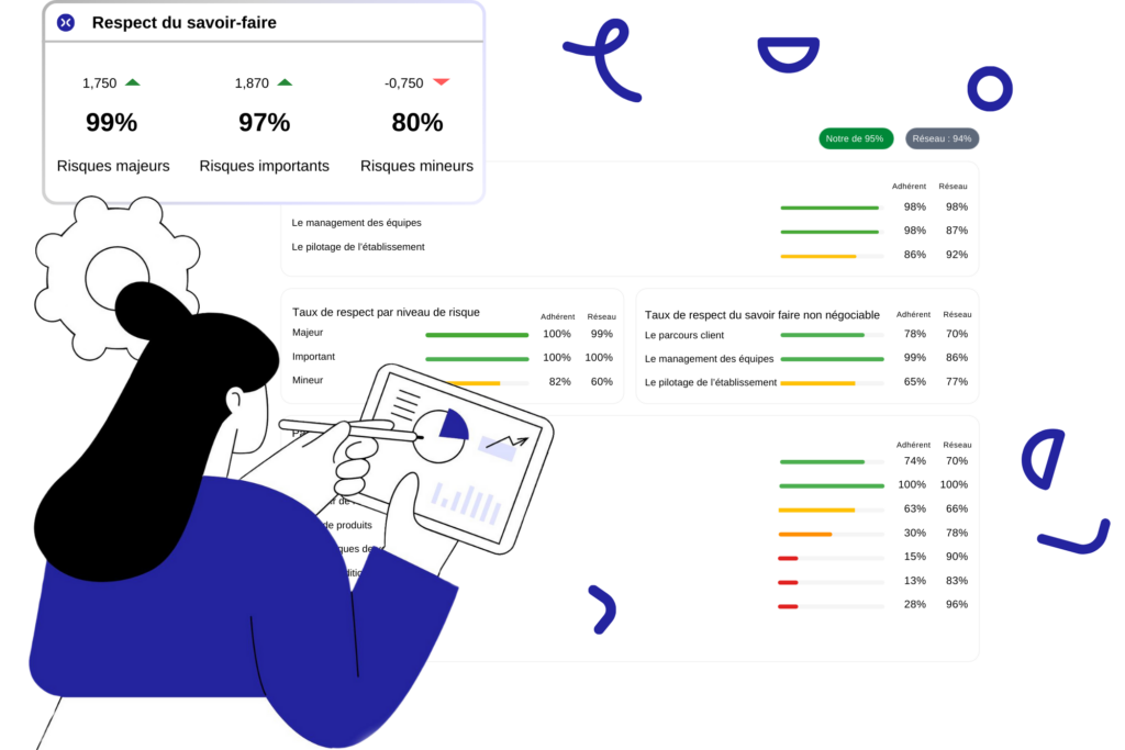 Visualisez le niveau de maîtrise du concept par vos membres en un clin d’oeil. Vous retrouverez la moyenne des résultats obtenus par établissement, le taux de respect du savoir-faire par niveau de risque, les établissements ambassadeurs, les établissements en difficulté.