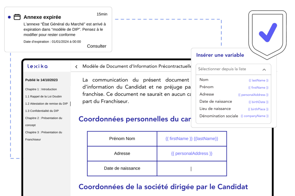 Économisez du temps et évitez les erreurs en insérant le bon contenu en fonction des données hébergées sur Lexika. Insérez des champs de variables, vous pourrez alors personnaliser un document avec les informations avant l’envoi.