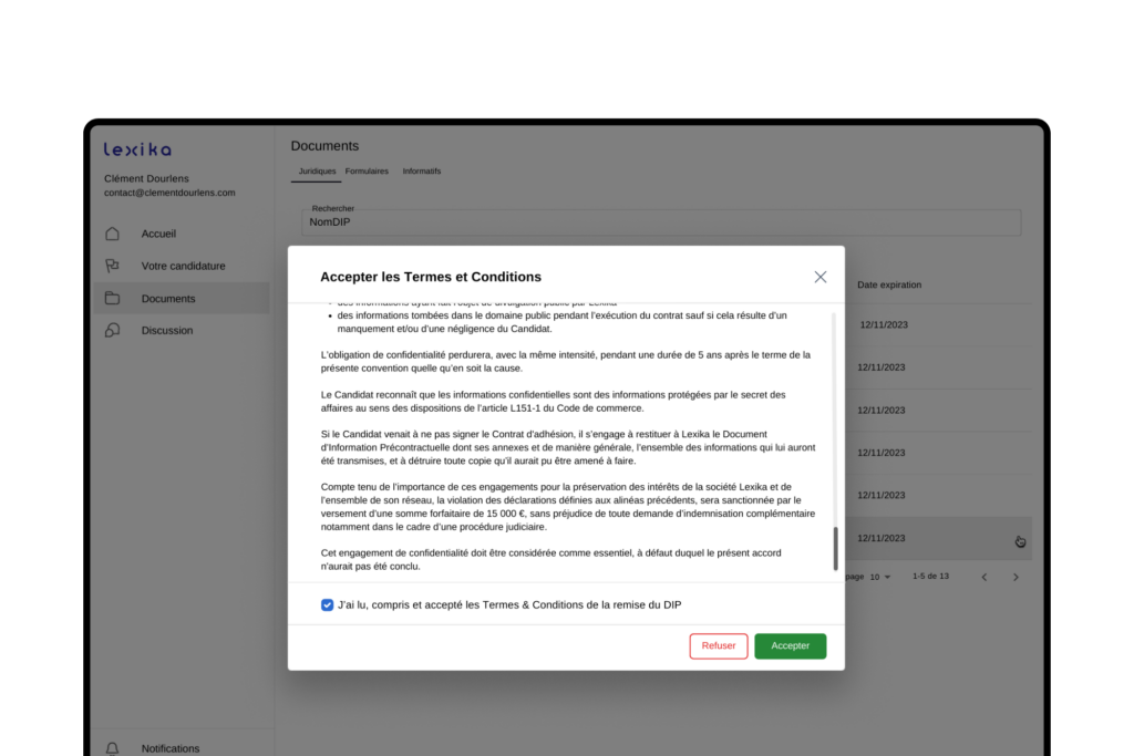 Générez un pop-up de termes et conditions de la remise du DIP à lire et accepter avant la consultation du document afin de recueillir le consentement du candidat. En cas de refus, le document devient inaccessible et vos données restent sécurisées.