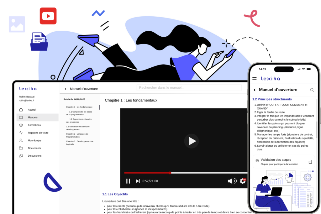 Chaque section de formation peut être rattachée à un chapitre d’un manuel de savoir-faire, ainsi permettant aux adhérents de naviguer entre théorie et pratique. Vos manuels seront plus interactifs qu’un simple bloc de texte.
