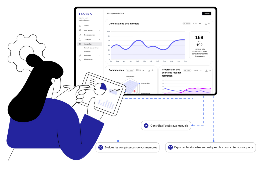 Depuis le tableau de bord du module de savoir-faire, analysez la performance de votre réseau, comparez des établissements entre eux sur les résultats des formations, la récurrence des consultations des manuels et d’autres indicateurs.